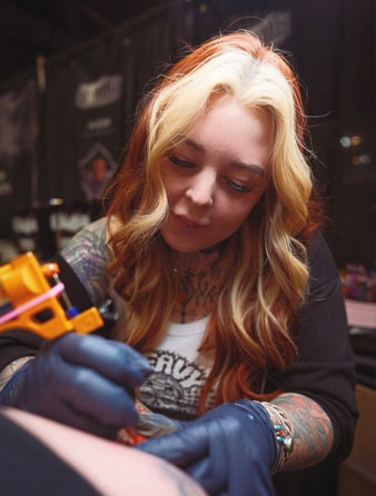 Lindsee specializes in bold traditional style with bright colors that is inspired by vintage imagery, but is also open to tattooing in other styles as well. Born & raised in Minnesota and tattooing since 2014. When not tattooing, Lindsee enjoys airbrushing on t-shirts, hanging out with her furbabies, friends and family, rolling around town in her Chevy van & making art!