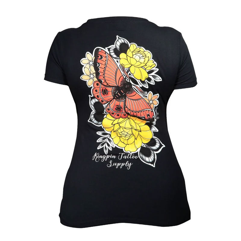 First we met with the ever so talented and driven @_sweetbtattoos_ a couple of weeks ago. She told us all about her love for tattooing and vision for her new shop @_anatomydivine_. Brissa Renee is a power house in the tattoo industry. Beginning her tattoo career at the age of 15, she now is on her way to owning multiple tattoo shops. She is a sponsored artist of both Kingpin Tattoo Supply and Hustle Butter. She specializes in large, colorful, neo-traditional girly designs and is forever 'loyal to the coil'. The Kingpin Women's Moth Shirt was custom designed by Brissa her self, scroll down to check it out!