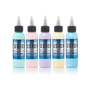 Offering a high pigment load, no filler ingredients, and a wide array of hues to choose from, Fusion Ink is a smooth, consistent, organic, vegan ink that's made for all styles of tattooing. The Pre-Packaged 5 color set includes: Pastel Pink, Lush Lilac, Lemon Drop, Soft Mint, and Blue Mist