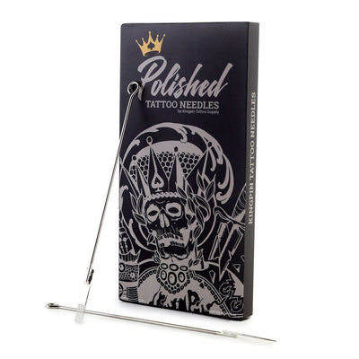 Kingpin offers 25 years of needle-building expertise with its newest polished Needle on Bar line. The polished, 316L surgical stainless steel pins offer seamless skin penetration with superior ink retention. All Kingpin Needles are crafted using a lab certified lead free silver bearing solder for maximum safety.