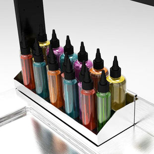 The TATSoul Forte Workstation Ink Holder is constructed entirely of stainless steel, and is designed to seamlessly attach to the rear lip of the forte workstation. The "Stadium-Style" arrangement lets you easily see and access your pigment, and the ink holder can be easily removed for cleaning or when you need extra workspace.